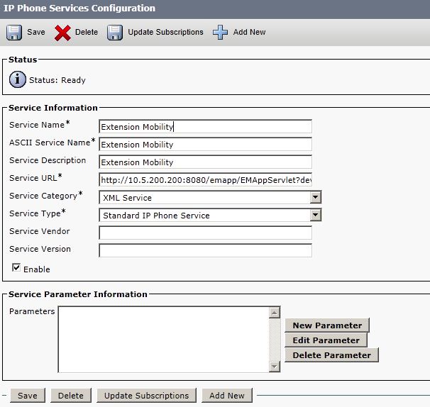 The service URL is : http://call-manager-IP:8080/emapp/EMAppServlet?device=#DEVICENAME#