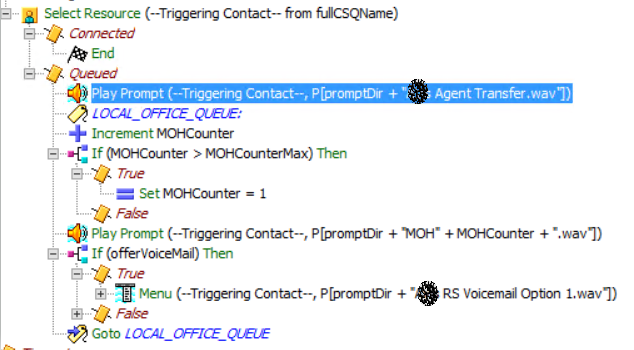 I looked at the script which was a bit complex as there were several IVR options with nested scripts. This particular case was related to option#4 where CCX will send the call to another script to check opening hours based on Local office number you dialed. I checked IVR logs and I can see the call has gone fine up until this point and got queued correctly. I could also hear Music on hold. This is the section of script which I was interested in.