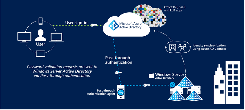When we configure Synchronization between on-prem AD environment and Azure AD (AAD) then the Password Hash Synchronization (PHS) is the default method used for User Authentication. This method synchronizes the ‘hash of the hash of users passwords’ from on-prem to AAD. This has its own merits and demerits. One of the issues could be related to Security as all your passwords hash are stored on Cloud (even though Microsoft assures it is very secure) and the other reason could be that you want to force some local Security and password policies which you cannot if you have only PHS enabled. The alternative is Pass-through Authentication (PTA) which allows users to sign in via their on-prem AD setup. The passwords are also not saved on Azure Cloud. The following authentication flow has been taken from Microsoft.