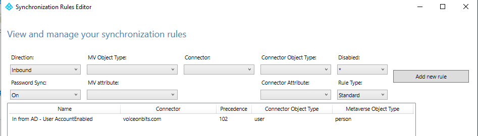 Start the Synchronization Rules Editor and set the filters Password Sync to On and Rule Type to Standard