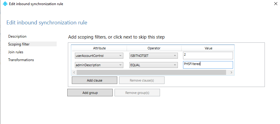 Select the rule In from AD – User AccountEnabled for the Active Directory forest you want to configure selective password had hash synchronization on and click Edit. Select Yes in the next dialog box to create an editable copy of the original rule.